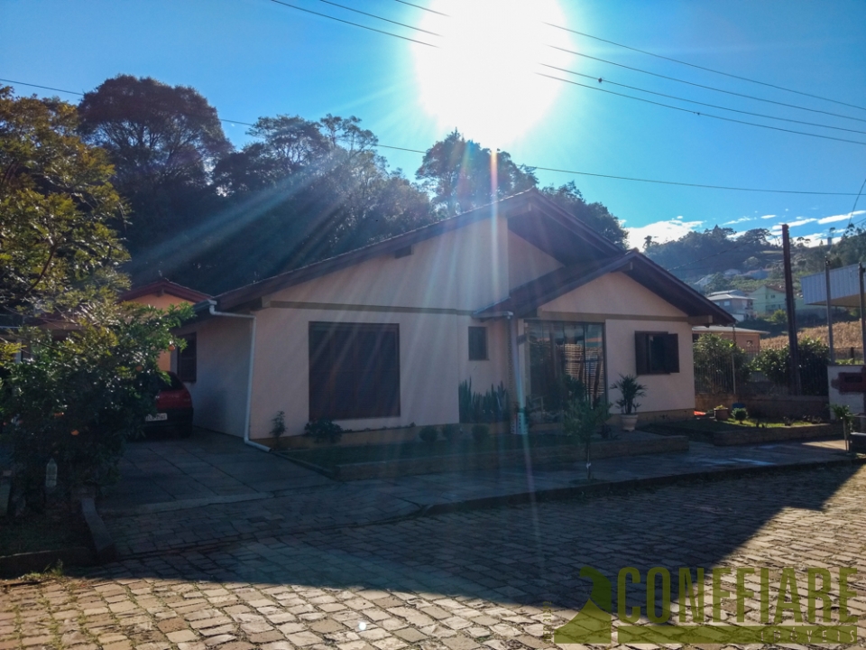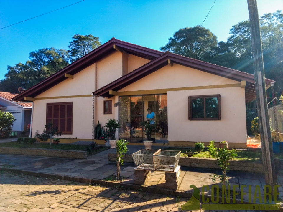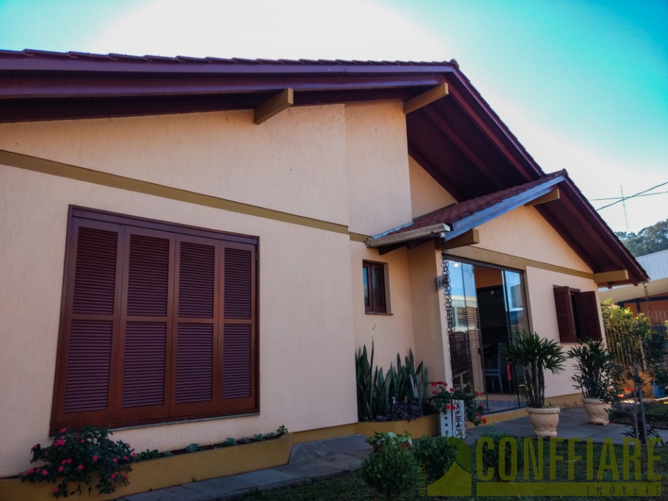 Casa com três dormitórios, sala de estar e jantar, cozinha, lavanderia e garagem.